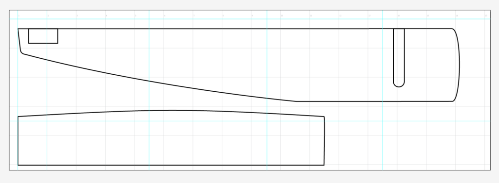 Step one is to draw the pattern you want to make, full size. By that I mean if you’re drawing an arm of a chair that will be 35″ long, make sure you drawing of it is 35″ long. Use the tools in your drawing software that provide the information on the size and dimensions of a drawing to help you. Also, makes sure you are accurate in every way. Lines intended to be straight must be drawn straight. Critical dimensions are exact. This is where CAD software excels. You can do it with graphic design drawing software as I have done, but it’s trickier.