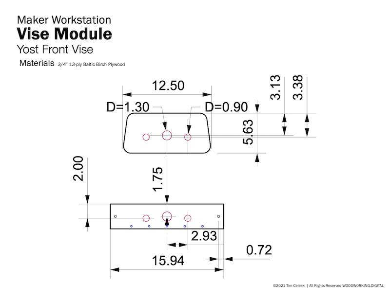The June 2021 issue of Popular Woodworking magazine features my article on the Maker Workstation. This is a basic PDF format drawing of the Workstation Vise Module that is a component of the workstation. It’s a MWS side plate with a bottom-mounted Yost 9″ woodworking vise. Other 9″ single screw, twin-rail front vises that basically are a frame without vise chops will work, but free-standing metal vises are too big to mount on the side plates. Refer to the vise installation instructions for the size and location of through holes. To make the module you’ll need a blank 16″ x 3.5″ side plate and 3/4″ 13-ply Baltic Birch plywood for the vise chop. I suggest making two chops and laminating them together. It’s easy to build the vise chop add-on module using standard woodworking tools.