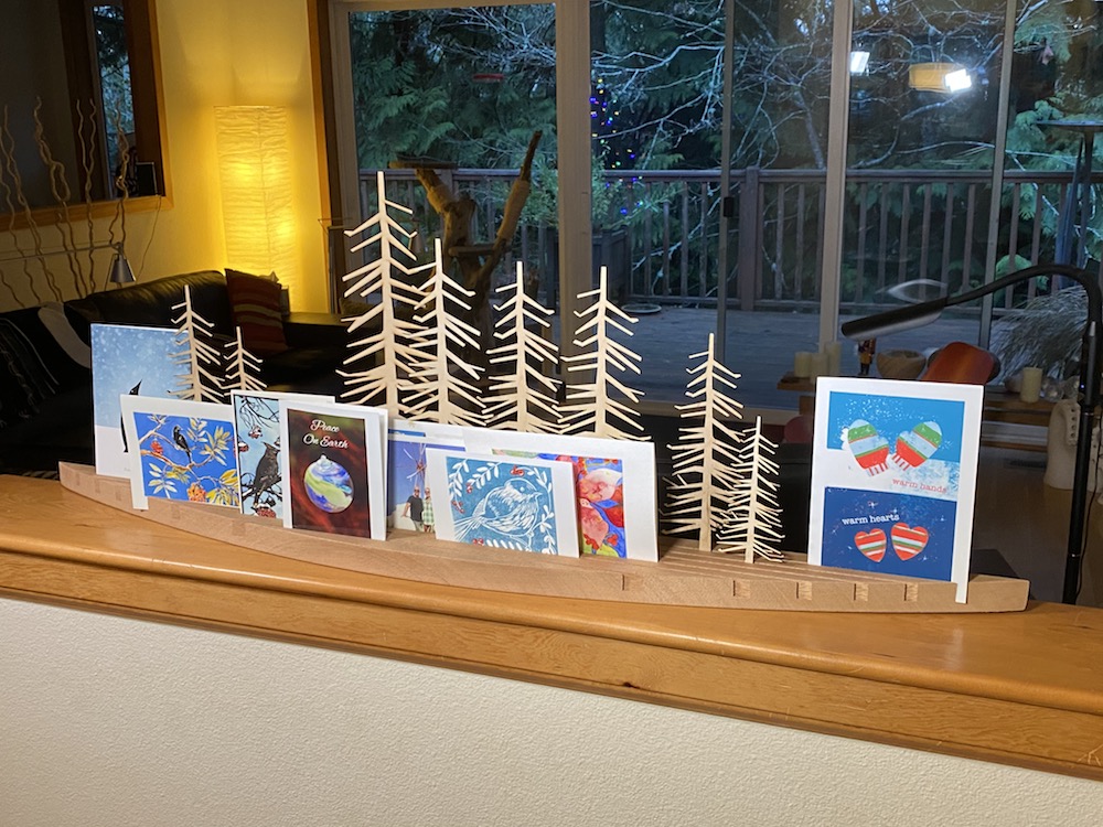 Starting with a tree I designed a few years ago plus a simple base, I came up with a last-minute holiday project to display greeting cards. The trees were cut out of 1/8″ plywood with a laser cutter, but you should be able to get just as good results on a CNC with a 1/8″ bit.